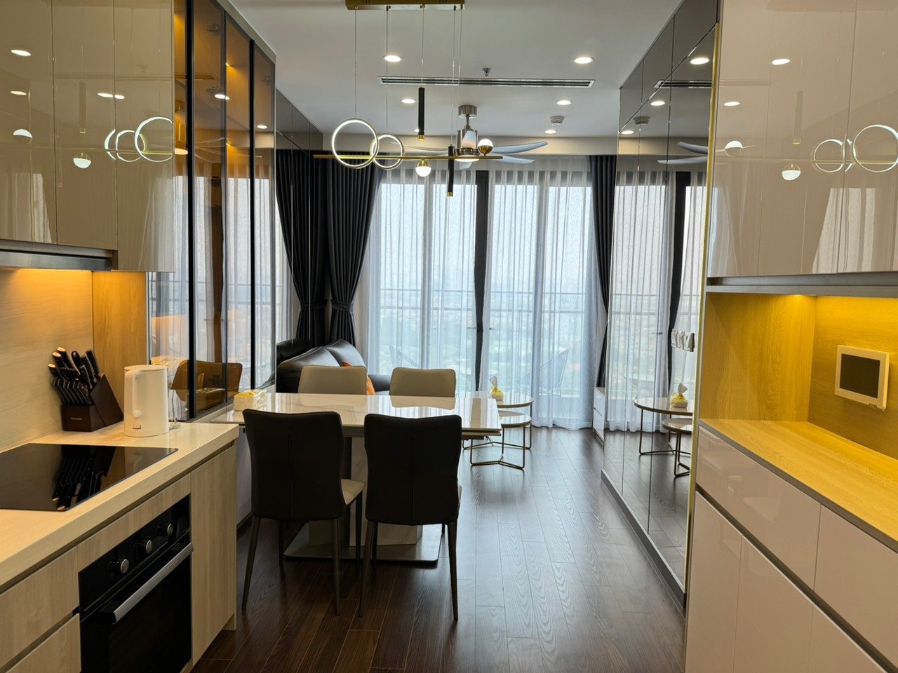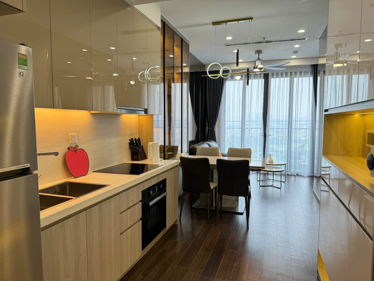 Khu vực bếp: tủ lạnh, xoong, nồi, nồi cơm, bát đũa, gia vị nấu ăn cơ bản, bếp từ, hệ thống hút mùi,...